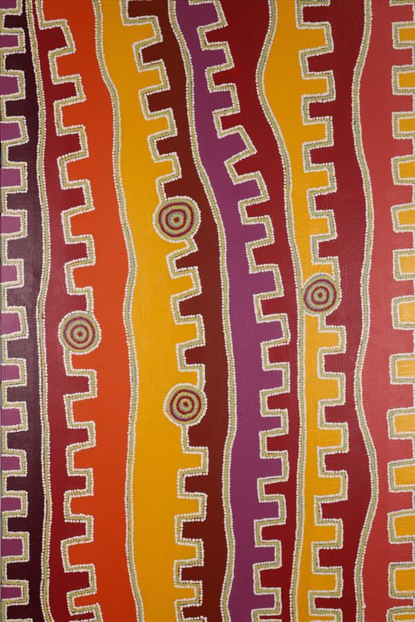 Mathew has painted his father’s country a long way south of Balgo, west of Jupiter Well in Pintupi country. This Tjukurrpa (dreaming) was given to Mathew by his father when he was a young man, he learned from the old people through stories and ceremony. This painting depicted the Tingarri Men (important creation dreaming) as they traveled from Jiggalong to Kiwirrkurra, Wilkinkarra and Tjikarri. Pali Pali is about people standing on someones back while they are dancing. Mathew says his culture is important, and you have to take it seriously, not get distracted by bad things like grog and drugs.