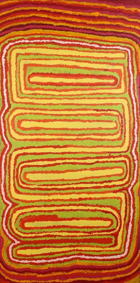 This painting depicts the story associated with Jimmy’s Tjukurrpa (dreaming), given to Jimmy by his father. This story is set in Jimmy’s traditional country of Tjukakarrinyu, east of Balgo in the Tanami Desert. The central weaving lines represent Tjurrnu (soak water) whilst the patterning surrounding it depict the Tali (sandhills).