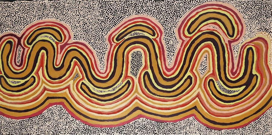 This painting depicts the story associated with Angie’s husband’s Tjukurrpa (dreaming), given to Jimmy by his father. This story is set in Jimmy’s traditional country of Tjukakarrinyu, east of Balgo in the Tanami Desert. The central weaving lines represent Tjurrnu (soak water) whilst the patterning surrounding it depict the Tali (sandhills).