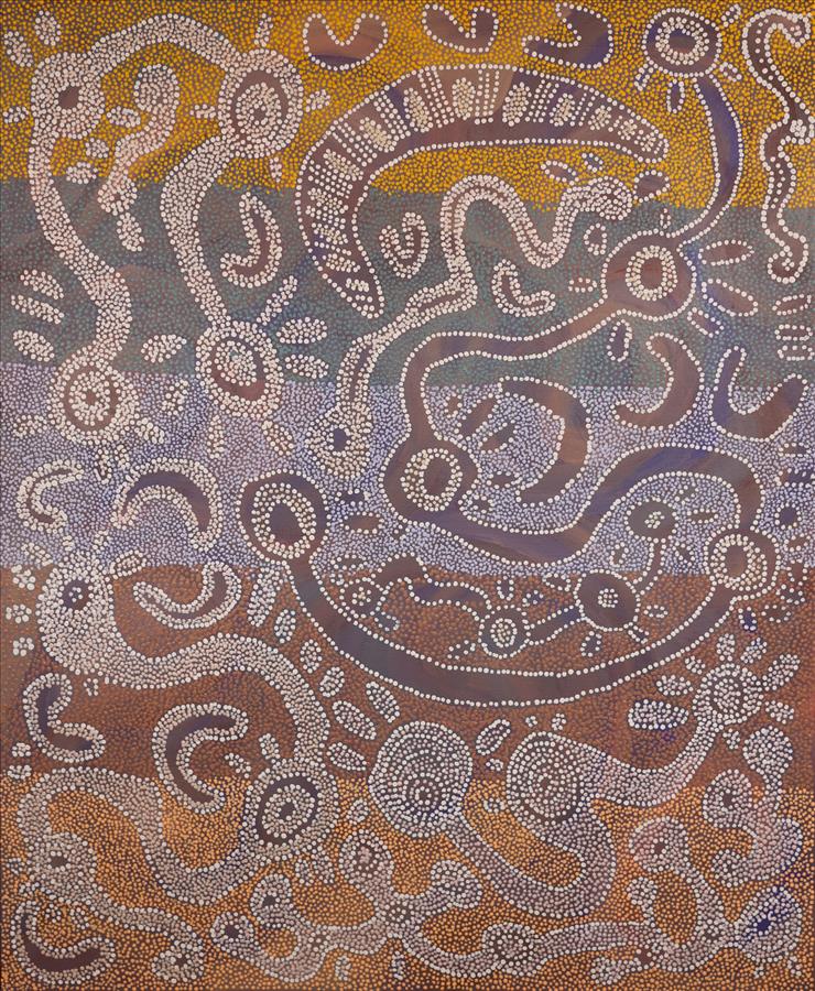 Miriam has depicted a story told by her Uncle Wimmitji which took place in Tjatjati, north of Jupiter Well. In the centre there are two eggs which were sung by Marparn men (healers) in a big Tingarri dreaming ceremony. They called on the native cat spirit near a sacred rock hole – also depicted in the centre. Two babies were born from the eggs from that ceremony. The oval shapes surrounding the eggs are Marparn men.