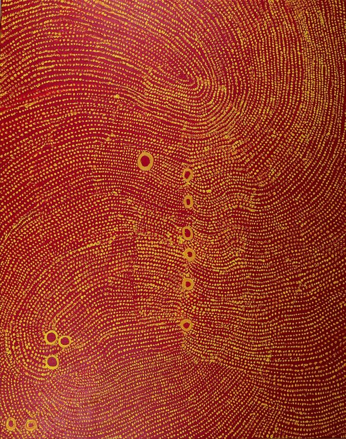 Jane has painted her mother’s traditional country, and the place in which she grew up – Kunawarritji, or Well 33 on the the Canning Stock Route. Shown here are the tali (sand dunes) which dominate the landscape of the area, with the tjurrnu (soakwater) Kunawarritji in the centre. The brown circles depict the holes where the ancestral spirit dog, Kinyu lived and its pups. During hard times when there was no kuka (meat) or mangarri (vegetable food) the old people would ask Kinyu for food and we would provide kangaroo or bush turkey, anything you wanted. This painting depicts women travelling through the land looking for the food.