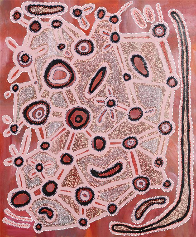 Miriam has depicted a story told by her Uncle Wimmitji which took place in Tjatjati, north of Jupiter Well. In the centre there are two eggs which were sung by Marparn men (healers) in a big Tingarri dreaming ceremony. They called on the native cat spirit near a sacred rock hole – also depicted in the centre. Two babies were born from the eggs from that ceremony. The oval shapes surrounding the eggs are Marparn men.