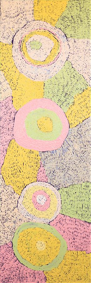 In this painting, Veronica tells of her mother, Sarah Daniel’s country. Depicted by the circular shapes are the various waterholes that are found in this area, while the sections of different colors and dots tell of the numerous bush tucker that is aplenty here.