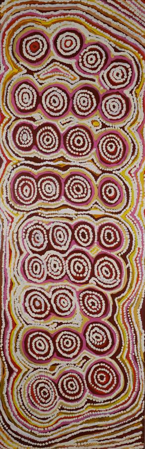 Here, Josephine has painted her country, and her families country; Nyilla, which near the Canning Stock route in the middle of the Great Sandy Desert.