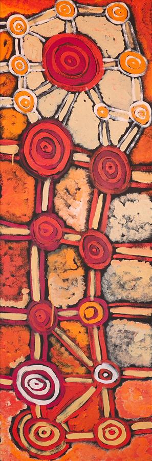 Simon’s paintings depict the dreaming stories and the travels of the Tingari, using the traditional concentric circle and line design. Tingari refers to the Dreaming and its Laws for the Pintupi language group of the Central Western Desert. The Tingari is the Creation era when the Dreamtime Ancestors moved across the lands, creating the features of the landscape and all aspects of the natural world.
