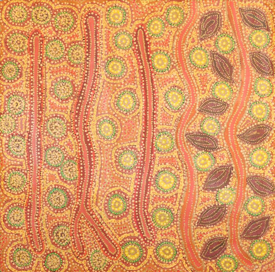 Anne has painted plants that grow around her country of Paruku (Lake Gregory), a vast salt lake near Mulan Community. Pumpunyi is a bush vine which is used from medicine. You can use the fruit, leaves and branches of this plant. The fruit can be mangarri (food) or medicine. The yellow seeds are boiled up, you can either drink it or use to wash sores.