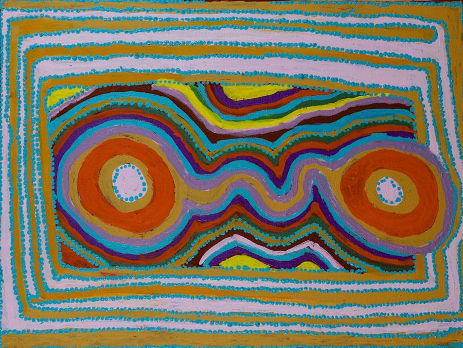 Angie has painted some of her country which is located around Purkitji (Sturt Creek). Depicted in Angie’s painting is the Sturt Creek river as seen by the three joining circles. Angie says this is good place for hunting and fishing. This place is very good for Pinyani (water lillies). To get the water lily you have to swim under water dig at the roots and collect the plant.