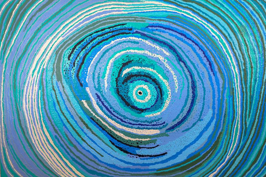 The dots scattered across the canvas speak of abundance — they represent the countless seeds that lie hidden in the earth, ready to sustain and nourish. In the centre of the work, the circles form a rhythmic pattern, symbolising the grinding stones, tools of tradition, used by her people to crush the seeds into flour for bush damper, the simple yet sacred bread of the land.
