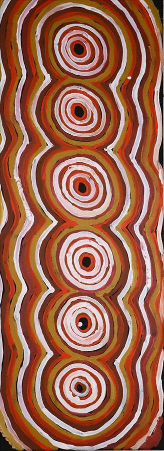 Here, Josephine has painted her country, and her families country; Nyilla, which near the Canning Stock route in the middle of the Great Sandy Desert.