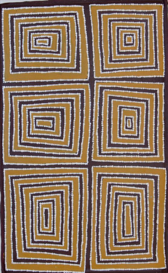 Monica has painted some of her father’s country Piparr, south of Yagga Yagga, this painting tells the Tjukurrpa (dreaming) story of a mother and father, they were walking and their baby was crying all day and night so the father said they had to drop the baby because a dingo started following them. So they dropped the baby and it turned into a rockhole, this site is called Tjitjiparrar. In this painting the red squares are sacred sites for women and men’s business – each one can’t enter the other.