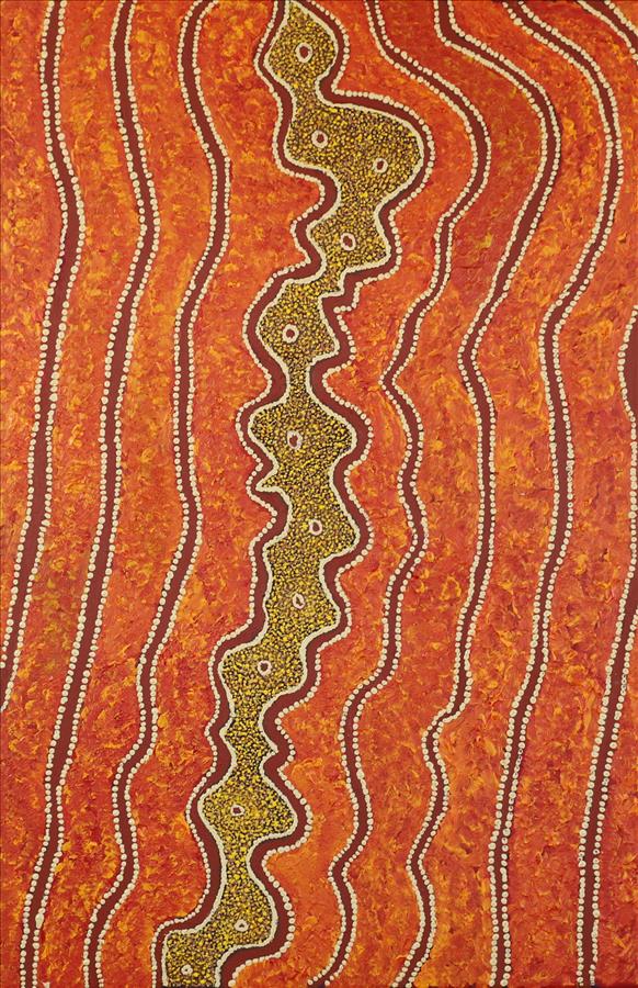 Jane has painted her mother’s traditional country, and the place in which she grew up – Kunawarritji, or Well 33 on the the Canning Stock Route. Shown here are the tali (sand dunes) which dominate the landscape of the area, with the tjurrnu (soakwater) Kunawarritji in the centre. The brown circles depict the holes where the ancestral spirit dog, Kinyu lived and its pups. During hard times when there was no kuka (meat) or mangarri (vegetable food) the old people would ask Kinyu for food and we would provide kangaroo or bush turkey, anything you wanted. This painting depicts women travelling through the land looking for the food.