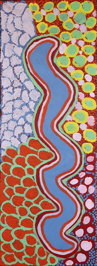Angie has painted some of her country which is located around Purkitji (Sturt Creek). Depicted in Angie’s painting is the Sturt Creek river. Angie says this is good place for hunting and fishing. This place is very good for Pinyani (water lillies). To get the water lily you have to swim under water dig at the roots and collect the plant.
