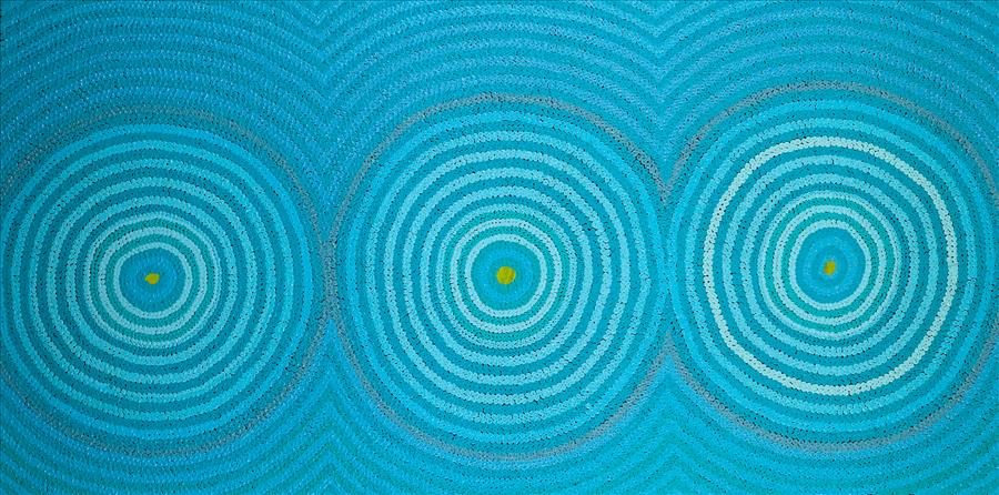 The shapes flanking the waterholes represent the windbreaks once used by the ancestors who travelled through this country during the Tjukurrpa (Dreamtime). Over time, these windbreaks have transformed into the towering sand dunes that now stretch across the desert, serving as silent witnesses to the passage of generations.