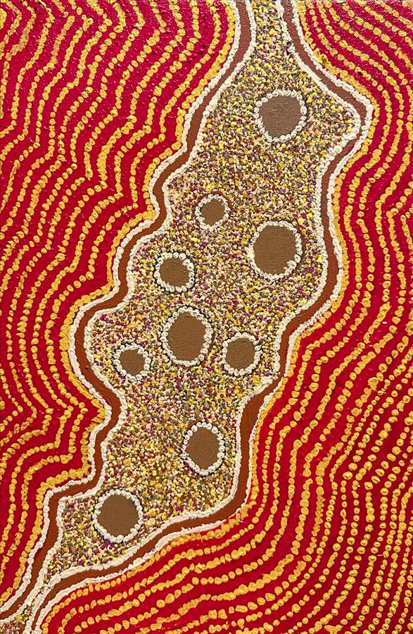 Jane has painted her mother’s traditional country, and the place in which she grew up – Kunawarritji, or Well 33 on the the Canning Stock Route. Shown here are the tali (sand dunes) which dominate the landscape of the area, with the tjurrnu (soakwater) Kunawarritji in the centre. The brown circles depict the holes where the ancestral spirit dog, Kinyu lived and its pups. During hard times when there was no kuka (meat) or mangarri (vegetable food) the old people would ask Kinyu for food and we would provide kangaroo or bush turkey, anything you wanted. This painting depicts women travelling through the land looking for the food.