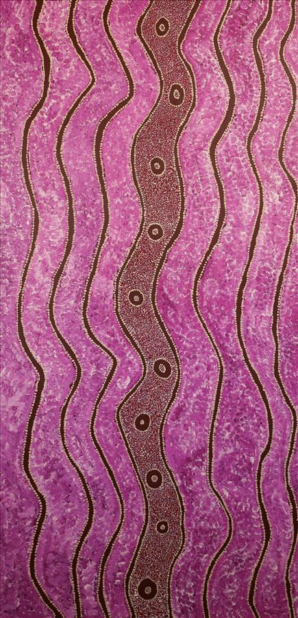 Jane has painted her mother’s traditional country, and the place in which she grew up – Kunawarritji, or Well 33 on the the Canning Stock Route. Shown here are the tali (sand dunes) which dominate the landscape of the area, with the tjurrnu (soakwater) Kunawarritji in the centre. The brown circles depict the holes where the ancestral spirit dog, Kinyu lived and its pups. During hard times when there was no kuka (meat) or mangarri (vegetable food) the old people would ask Kinyu for food and we would provide kangaroo or bush turkey, anything you wanted. This painting depicts women travelling through the land looking for the food.