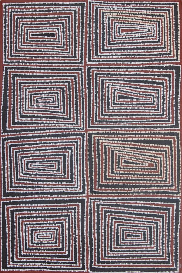 Monica has painted some of her father’s country Piparr, south of Yagga Yagga, this painting tells the Tjukurrpa (dreaming) story of a mother and father, they were walking and their baby was crying all day and night so the father said they had to drop the baby because a dingo started following them. So they dropped the baby and it turned into a rockhole, this site is called Tjitjiparrar. In this painting the red squares are sacred sites for women and men’s business – each one can’t enter the other.