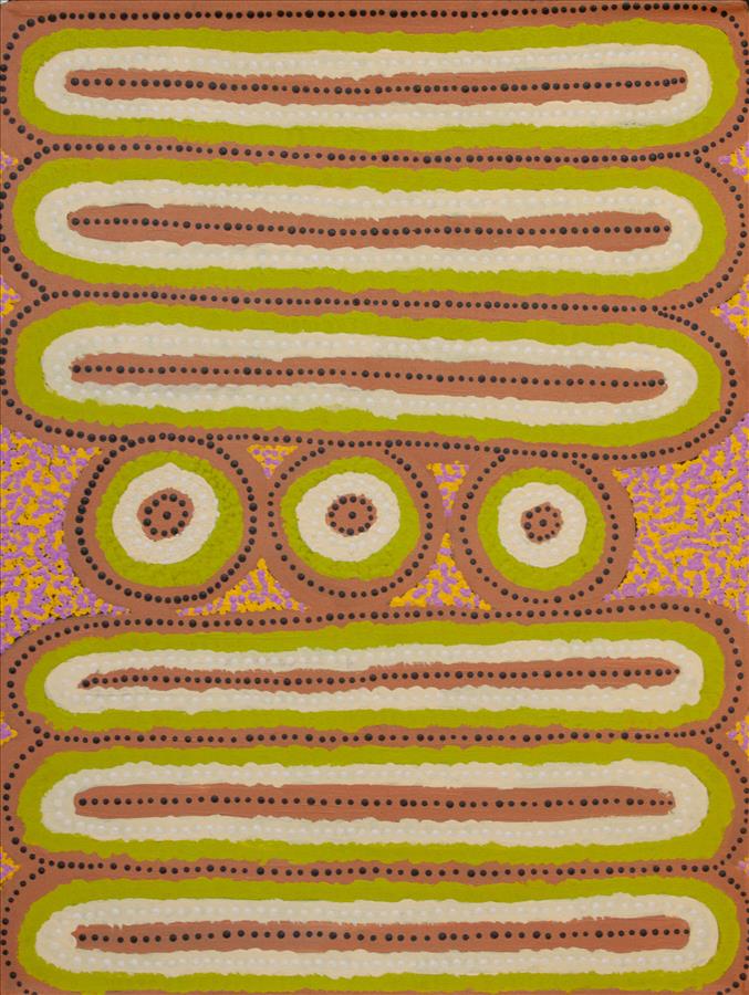This painting depicts some of the country of Bridget’s father. This country is located along the middle stretches of The Canning Stock Route in The Great Sandy Desert, near Well 33. The landscape in this area is dominated by talis, or sand dunes. Among the talis, to those who know, are water holes and soakwaters.