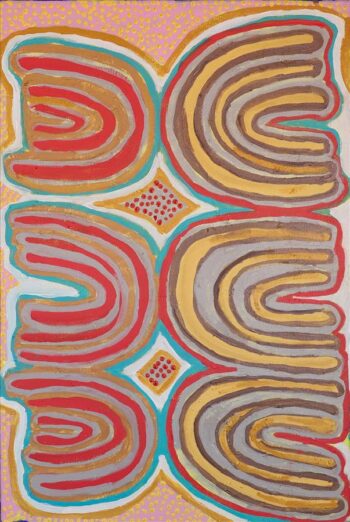 The painting is marked by long, flowing parallel lines that represent the tali — the sand dunes — that shape and define this vast and powerful landscape. Through these lines, Helicopter evokes both memory and geography, mapping the contours of a life lived close to Country.