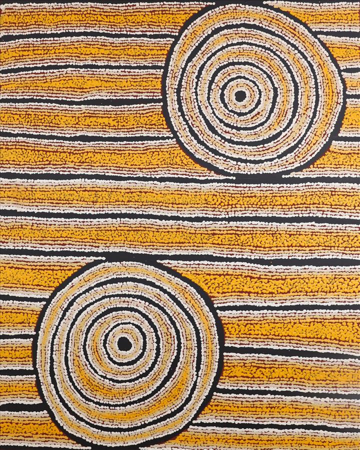 Cindy has painted her Grandmother’s (Eileen Napaltjarri’s) Country on her dad’s side. This painting depicts designs associated with the rockhole and soakage water site of Tjiturrulpa, situated in the rocky hills west of Kintore community.