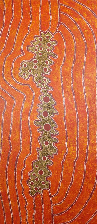 Jane has painted her mother’s traditional country, and the place in which she grew up – Kunawarritji, or Well 33 on the the Canning Stock Route. Shown here are the tali (sand dunes) which dominate the landscape of the area, with the tjurrnu (soakwater) Kunawarritji in the centre. This painting depicts old women travelling to different waterholes looking for their grinding stones. They collected all their bushtucker but couldn’t find the stones, they said “where did they go?” and they went searching around all the soakwaters. They found them at a big rock holes which has a big cave underneath, the water here is nice a cool. This is Jane’s grandmother’s Tjukurrpa (dreaming).
