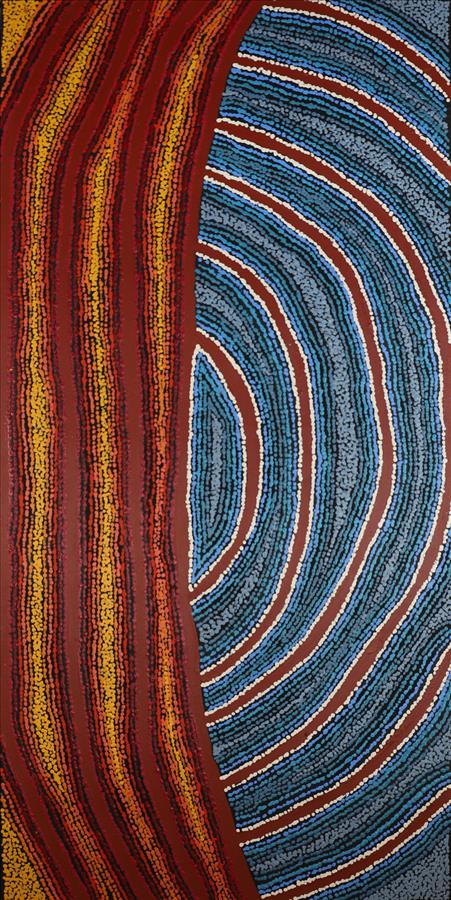 Cindy has painted her Grandmother’s (Eileen Napaltjarri’s) Country on her dad’s side. This painting depicts designs associated with the rockhole and soakage water site of Tjiturrulpa, situated in the rocky hills west of Kintore community.