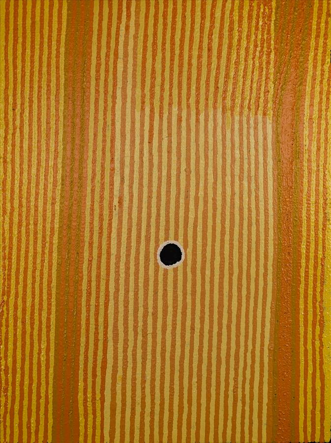 Cynthia Nanala has painted some of her father, Tjumpo’s (dec) traditional country, which is centred around the vast salt lake known as Wilkinkarra, or Lake Mackay. Her father was a senior custodians for Wilkinkarra. Wilkinkarra is situated far to the south of Balgo in the Great Sandy Desert and is at the centre of many important stories. This painting depicts Wilkinkarra in the centre, surrounded by the tali, or sand dunes which dominate the landscape of the area. Around the lake yellow and white flowers are seen blooming during the right season.