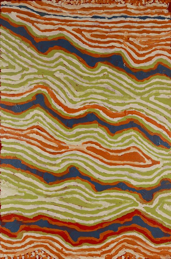 The painting is marked by long, flowing parallel lines that represent the tali — the sand dunes — that shape and define this vast and powerful landscape. Through these lines, Helicopter evokes both memory and geography, mapping the contours of a life lived close to Country.