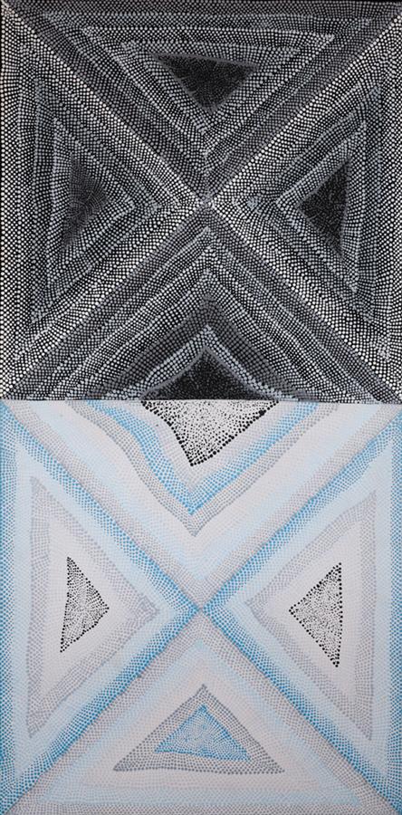 Amanda has painted some of her Grandmother’s country called Mina Mina located well south of Balgo in the Great Sandy Desert. Amanda has interpreted her Grandmother, Dorothy Napangardi’s style of painting. She has depicted the movement of ancestral women across the country as they danced, encountered others, and interacted in significant events, which occured along the way. She has painted how the country appeared to her grandmother (told through stories), of dry salt lakes and rockholes, interlaced with ancestral tracks.