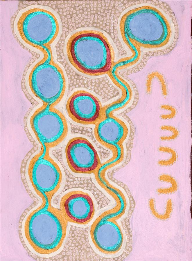 Angie has painted some of her country which is located around Purkitji (Sturt Creek). Depicted in Angie’s painting is the Sturt Creek river. Angie says this is good place for hunting and fishing. This place is very good for Pinyani (water lillies). To get the water lily you have to swim under water dig at the roots and collect the plant.