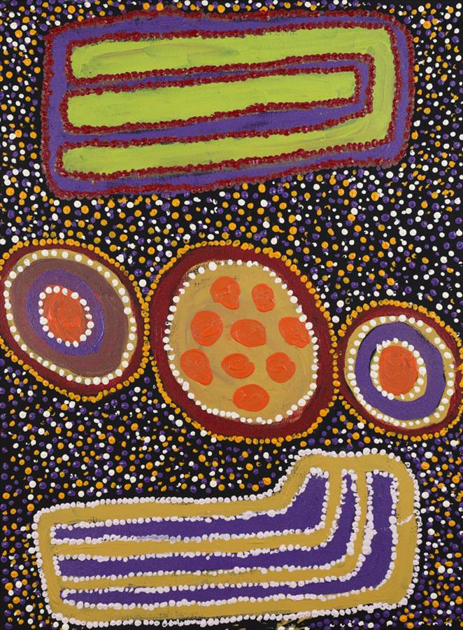 Angie has painted some of her country which is located around Purkitji (Sturt Creek). Depicted in Angie’s painting is the Sturt Creek river as seen by the three joining circles. Angie says this is good place for hunting and fishing. This place is very good for Pinyani (water lillies). To get the water lily you have to swim under water dig at the roots and collect the plant. Angie says that Pinyani is sweet and juicy and it tastes like apples and it’s the culture that her Tja Tja (grandmother), Nungurrayi, taught her as she grew her up.