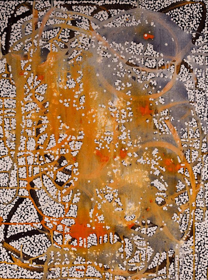 Here, Cherylyn has depicted Mina Mina; a series of saltpans nestled around Lake MacKay, north-west of Yuendumu in central Australia bordering on the Tanami & Gibson Desert.