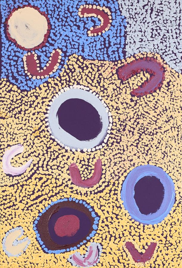 In this painting, Veronica tells of her mother, Sarah Daniel’s country. Depicted by the circular shapes are the various waterholes that are found in this area, while the sections of different colors and dots tell of the numerous bush tucker that is aplenty here.