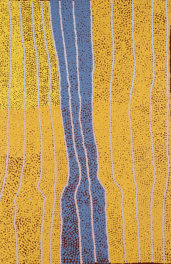 Winifred Nanala has painted some of her father’s traditional country, which is centred around the vast salt lake known as Wilkinkarra, or Lake Mackay. Her father was a senior custodians for Wilkinkarra. Wilkinkarra is situated far to the south of Balgo in the Great Sandy Desert and is at the centre of many important stories. This painting depicts Wilkinkarra surrounded by the tali, or sand dunes which dominate the landscape of the area.