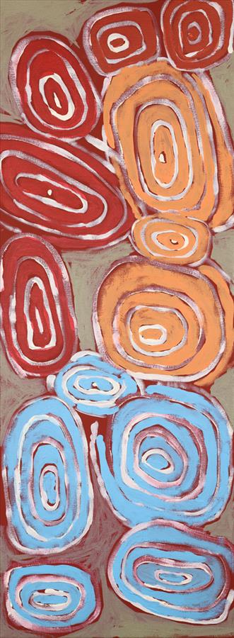 Simon’s paintings depict the dreaming stories and the travels of the Tingari, using the traditional concentric circle and line design. Tingari refers to the Dreaming and its Laws for the Pintupi language group of the Central Western Desert. The Tingari is the Creation era when the Dreamtime Ancestors moved across the lands, creating the features of the landscape and all aspects of the natural world.