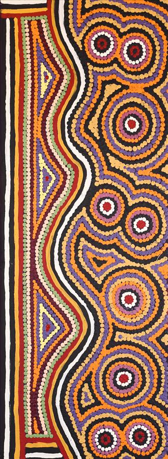 Nakamarra (Joan) has painted her mothers story some of her traditional country, which is located north east of Balgo, near the community of Kundat Tjaru, or Ringer Soak. The strong black line is a kiliki, or creek that runs intermittently through the country known as Yarluman. The larger circles depict the soakwaters, or tjumu, that are a dependable source of water in the desert areas. The smaller circles are a specific type of warta, or tree that grows around here.