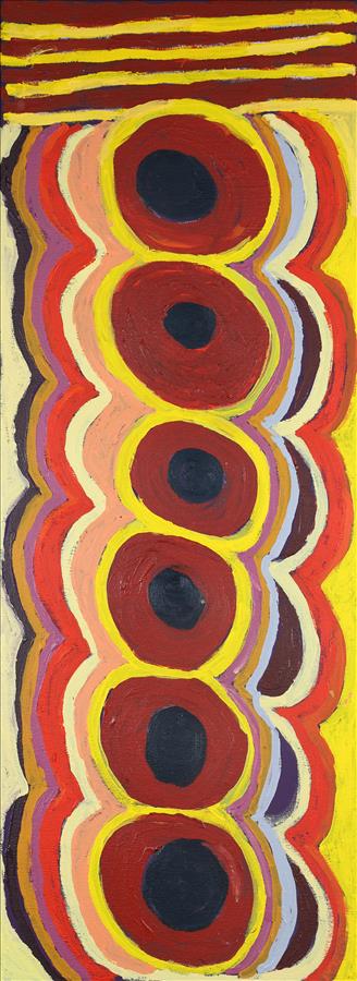 Angie has painted some of her country which is located around Purkitji (Sturt Creek). Depicted in Angie’s painting is the Sturt Creek river as seen by the three joining circles. Angie says this is good place for hunting and fishing. This place is very good for Pinyani (water lillies). To get the water lily you have to swim under water dig at the roots and collect the plant. Angie says that Pinyani is sweet and juicy and it tastes like apples and it’s the culture that her Tja Tja (grandmother), Nungurrayi, taught her as she grew her up.