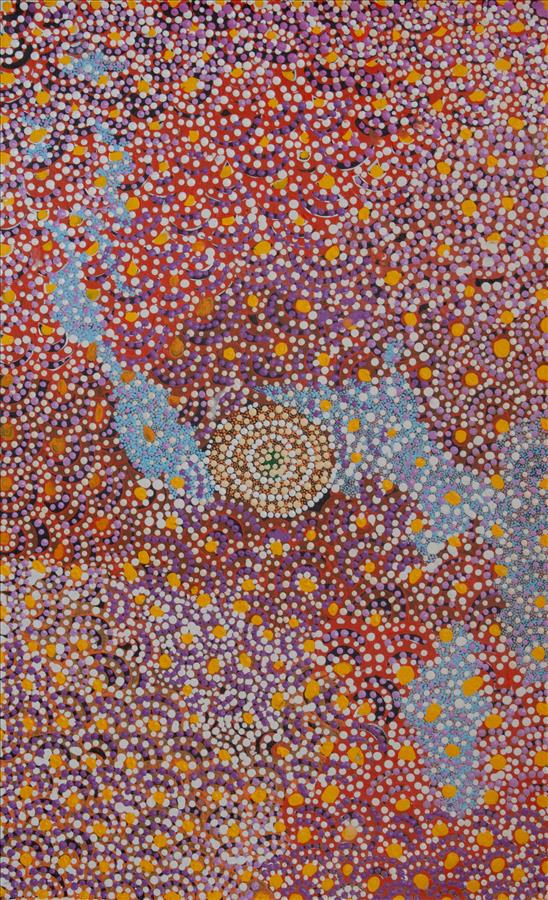 In this painting, Maggie depicts bush raisins that grow around Jupiter Well, near Well 33. These native fruits are collected, dried, and eaten as an important bush food.