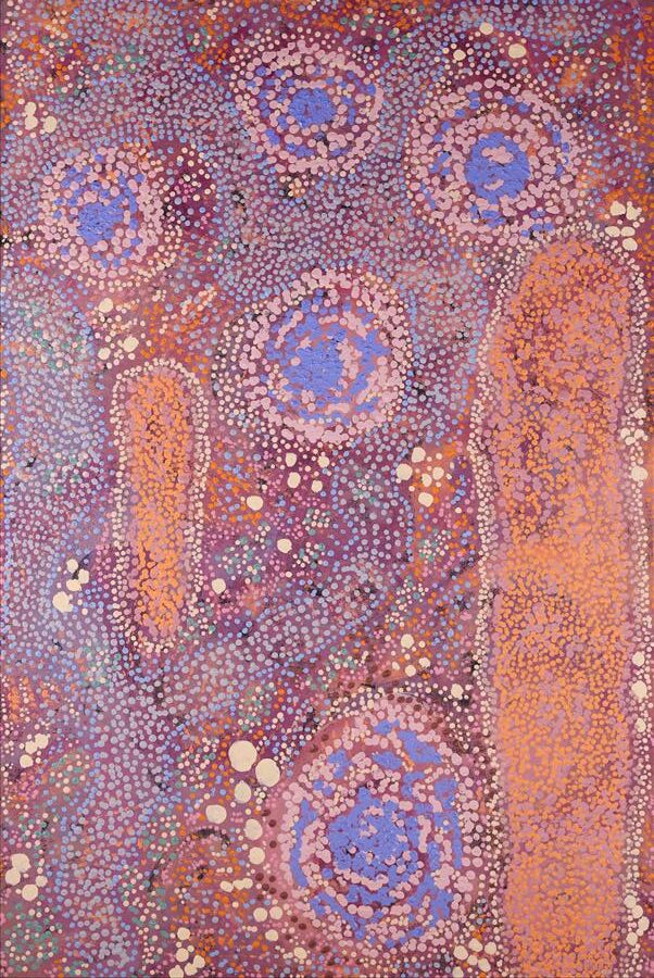 This is the Luurnpa Tjukurrpa (Kingfisher Dreaming). Luurnpa put its beak into a hole in the ground and a group of people climbed out from the hole onto the Kingfisher’s back. The central circle is a site close to Wirrimanu (Balgo) where Luurnpa transformed. Circles above this are uncleaned soaked waters that are not to be drunk. They are representative of two ancestral women of the Tjukurrpa who were travelling around this country. The undulating lines represent the escarpment of Wirrimanu which are flanked by creek lines. The shape at the top of the painting is a large sand hill. This is Miriam’s father’s and uncle’s country.