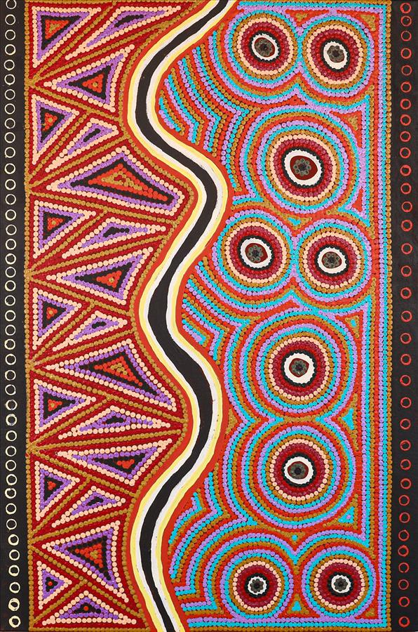 Nakamarra (Joan) has painted her mothers story some of her traditional country, which is located north east of Balgo, near the community of Kundat Tjaru, or Ringer Soak. The strong black line is a kiliki, or creek that runs intermittently through the country known as Yarluman. The larger circles depict the soakwaters, or tjumu, that are a dependable source of water in the desert areas. The smaller circles are a specific type of warta, or tree that grows around here.