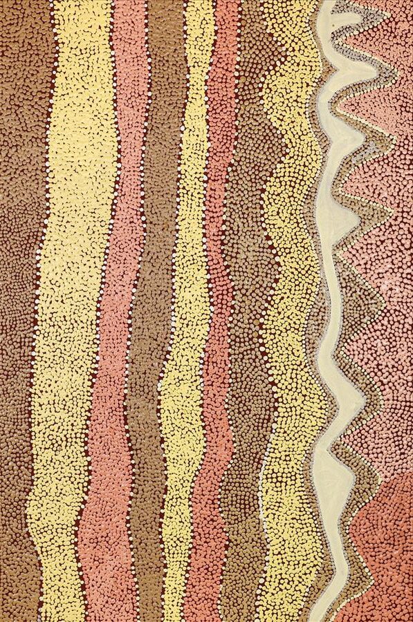 Winifred Nanala has painted some of her father’s traditional country, which is centred around the vast salt lake known as Wilkinkarra, or Lake Mackay. Her father was a senior custodians for Wilkinkarra. Wilkinkarra is situated far to the south of Balgo in the Great Sandy Desert and is at the centre of many important stories. This painting depicts Wilkinkarra surrounded by the tali, or sand dunes which dominate the landscape of the area.