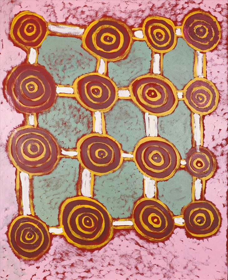 Simon’s paintings depict the dreaming stories and the travels of the Tingari, using the traditional concentric circle and line design. Tingari refers to the Dreaming and its Laws for the Pintupi language group of the Central Western Desert. The Tingari is the Creation era when the Dreamtime Ancestors moved across the lands, creating the features of the landscape and all aspects of the natural world.