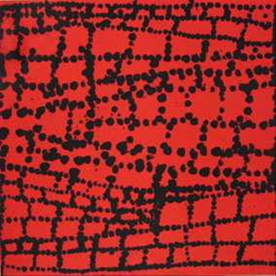 Kathleen has depicted some important country for her family, which is south of Balgo in the Great Sandy Desert. This country is named Nakarra Nakarra and is one of the sites of the Seven Sisters Dreaming, a story about seven sisters who travel the ancestral landscape running from an old man who wants to marry the youngest. At Nakarra Nakarra a group of hills embody the seven sisters. The circle depicted represents a tjurrnu (soakwater) and the red blocks of colour show the women dancing.