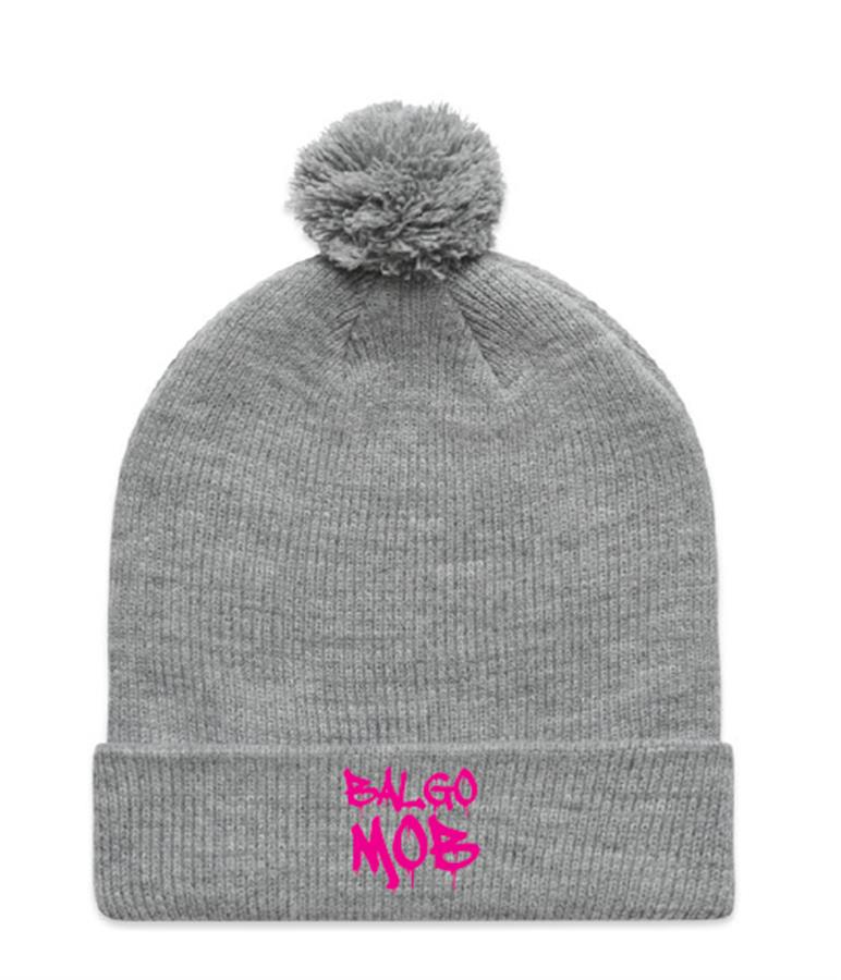 Grey beanie with pom-pom featuring ‘Balgo Mob’.