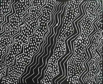 Helicopter has painted some of his country south of Balgo, in the Great Sandy Desert. This country is named Wangkartu after the tjurrnu (soakwater) in this country. This is the country where Helicopter was born. The dots are bush tucker; fruit trees, apple trees. Mangarri (food).