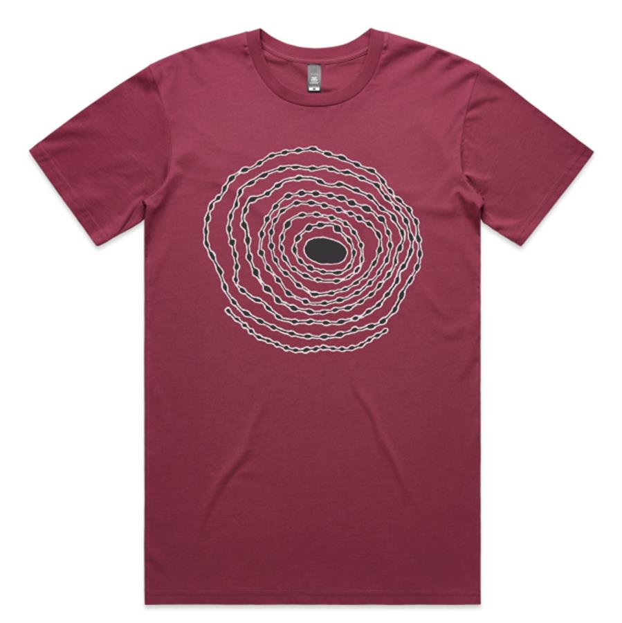 Berry t-shirt with front printed design by Hayley Mudgedell, featuring ‘Balgo Mob’ embroidered on the back.